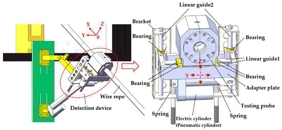 The testing probe is closed to encircle the wire rope in the testing process and is driven by a floating tracking mechanism which allows the Y and Z degrees of freedom to be released so as to accommodate the vibration and wobble of the wire rope, thereby tracking the movements of the rope to detect. The floating tracking mechanism mainly consists of the first linear guide bar, bearing adapter plate, the second linear guide bar and the bottom plate, as shown in Figure 17. The testing probe controlled by the cylinder (electric cylinder) is installed on the first linear guide bar by the bearing, which is installed on the bearing adapter plate, and this part allows the testing probe to be freely moved in the Y direction. The bearing adapter plate is installed on the second linear guide bar by the bearing. The second linear guide bar is perpendicular to the first linear guide bar and is installed on a base plate connected to the rocker arm and the lifting cylinder (electric cylinder); this part can enable the probe to move freely in the Z direction. A spring is also connected between the bearing adapter plate and the bottom plate so that, on the one hand, the probe remains at the midpoint of the slide in the Z-direction of the tracking mechanism, and, on the other hand, the jitter amplitude in the Z-direction of the wire rope may be dynamically adjusted, cushioning and absorbing the changes in the attitude of the probe.