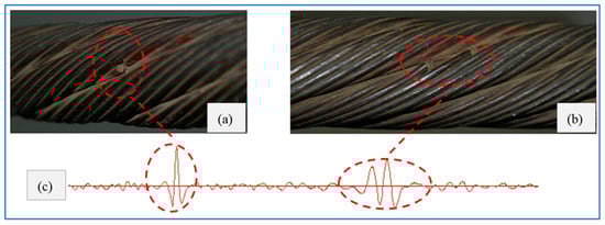 Specimen with defects: (a) single broken wire; (b) two adjacent broken wire; and (c) detection signals.