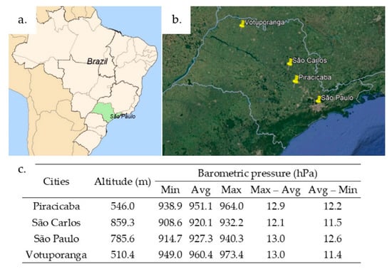 Figure 1 summarizes five years of barometric pressure data for some cities in São Paulo state, Brazil, where hourly barometric pressure data were available. Data were obtained from the Brazilian National Institute of Meteorology (INMET) database and from the weather station available at ESALQ/USP.