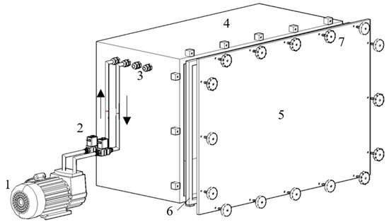 Schematic of the barometric chamber components: (1) pressure/vacuum air pump; (2) pressure and vacuum proportional valves; (3) wire connections; (4) barometric chamber box; (5) barometric chamber lid; (6) sealing tape; (7) bolts.