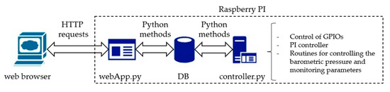 The controller.py is the application in charge of synchronizing the database ‘control’ table and the GPIOs, as well as launching routines for controlling the barometric pressure and for monitoring variables inside the chamber. The database (DB) has only two tables: (1) ‘control’ and (2) ‘records’. The ‘control’ table has several fields but a single record. Only update operations are allowed in the ‘control’ table and such operations may occur due to requests from controller.py or webApp.py. The ‘records’ table also has several fields and is used to save data gathered during experiments carried out in the barometric chamber. Data in this table are used to generate charts and reports of experiments. The controller.py also has the algorithm in charge of controlling the barometric pressure within the chamber. There is a routine used for ramp stages (i.e., stages 1 and 3) and another for steady stages (i.e., stages 2 and 4). Both routines implement a PI controller that reads the barometer and computes new output values every 0.2 s, as already mentioned in the control system.