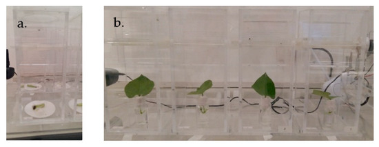 Release devices installed inside the chamber: (a) segments of bean pods offered to E. heros adults; (b) bean leaves offered to D. speciosa adults.