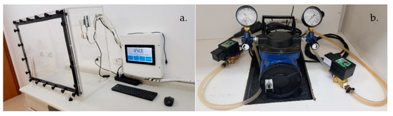 Barometric chamber built for entomology experiments (INCT Semiochemicals in Agriculture): (a) chamber and electronic control system; (b) air pump and proportional solenoid valves.