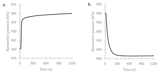 The barometric pressure inside the chamber was monitored by a Young model 61302V (Young, Traverse City, MI, USA) barometric pressure sensor with a resolution of 0.01 hPa [27]. The sensor was set to operate in the range from 850 to 1050 hPa in which voltage output varies from 0 to 5000 mV. Equation (1) is given by the manufacturer to convert the analogue signal into barometric pressure.