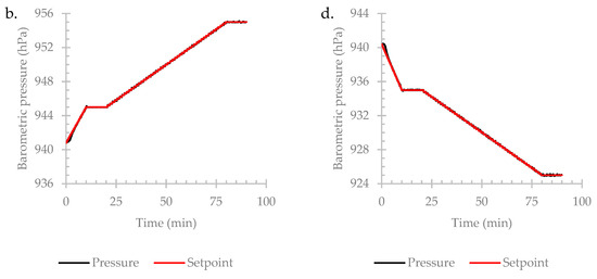 Figure 9 shows the results of short-term tests run to demonstrate that the chamber works as expected. Test 1 (Figure 9a,b) consisted of the following stages: (1) stage 1—the barometric pressure was gradually increased to 945 hPa in 10 min; (2) stage 2—a pressure of 945 hPa was maintained for 10 min; (3) stage 3—the barometric pressure was gradually increased to 955 hPa in 60 min; (4) stage 4—a pressure of 955 hPa was maintained for 10 min. Test 2 (Figure 9c,d) consisted of the following stages: (1) stage 1—the barometric pressure was gradually decreased to 935 hPa in 10 min; (2) stage 2—a pressure of 935 hPa was maintained for 10 min; (3) stage 3—the barometric pressure was gradually decreased to 925 hPa in 60 min; (4) stage 4—a pressure of 925 hPa was maintained for 10 min.