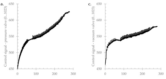 Results of long-term tests run to demonstrate that the chamber works as expected: (a) test 3—control signal fluctuations while controlling the pressure valve; (b) test 3—rising pressure within the barometric chamber; (c) test 4—control signal fluctuations while controlling the vacuum valve; (d) test 4—decreasing pressure within the barometric chamber.