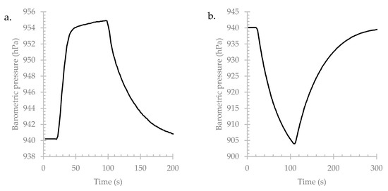 The literature also reports smaller barometric chambers in which pressure was manually controlled by injecting volumes of air and checking a barometric pressure gauge [10,17,29]. Although such designs are technically feasible, they require the user to continuously check the pressure and, despite this, poor performance (i.e., accuracy, stability) is expected to occur while controlling the pressure. In addition, reproducing real pressure fluctuations would hardly be achieved by manual control, since the changes in barometric pressure are small and occur very slowly in nature.