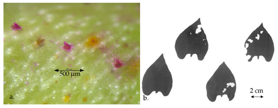 Stylet sheath (violet dots) indicates food activity damage to bean pods by E. heros (a); white holes in the leaves indicate leaf consumption by D. speciosa (b).