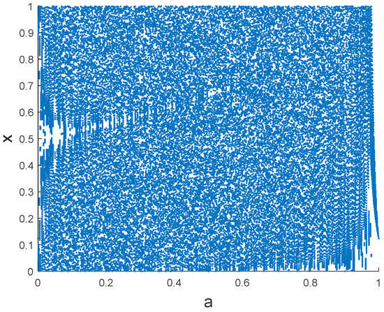 Figure 1 shows the bifurcation diagram of Kent chaos. When the parameter value is and the initial value is , Kent chaos is in a chaotic state.