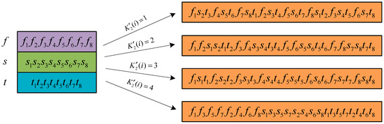 - After each selection of pixels , , and , the binary bits will be recombined. The 8 bits of pixel are recorded as , and are similar. In addition, the method of recombination is shown in Figure 5, which is divided into four types. Choose the corresponding method for recombination. The calculation of is as follows:where .