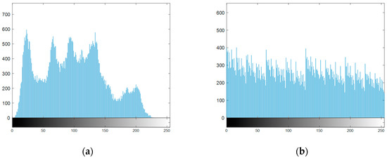 Table 3 and Table 4 show the results of the information entropy test. It should be noted that the scrambled intermediate cipher image of this algorithm is a one-dimensional sequence of length . For the convenience of comparison, it is rearranged into an image with a size of for processing. Compared with the algorithm put forth in [4] that uses single-pixel bit scrambling and those described in [7,8] that use adjacent-pixel bit scrambling, the information entropy of the scrambled intermediate cipher image and final cipher image is closer to the ideal value 8. After encryption by the algorithm in this paper, the pixel value has an excellent random distribution characteristic.