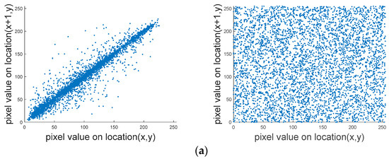 The strong correlation between adjacent pixels is one of the characteristics of image data. It is necessary to make adjacent pixels as irrelevant as possible. The correlation coefficient can reflect the degree of association between adjacent pixels. A correlation coefficient close to 0 represents a weak correlation between adjacent pixels, and it is difficult for attackers to use this information to conduct statistical attacks. The correlation coefficient is computed as follows [16,17]: