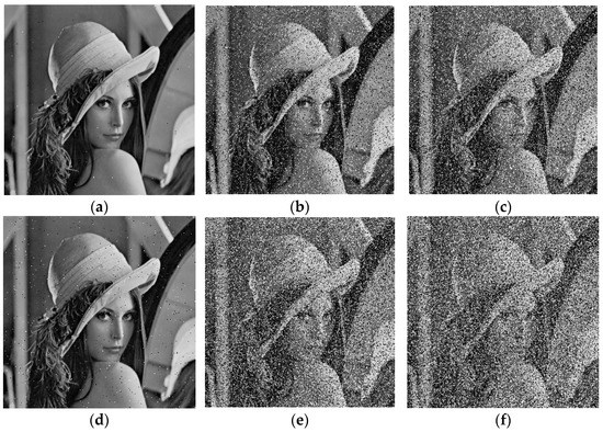 Cipher images of Lena were processed with different intensities of salt and pepper noise (SPN), speckle noise (SN), and Gaussian noise (GN), and then decrypted, as shown in Figure 12. With the increase in noise intensity, the decoded images become less clear. Among them, the decrypted images processed by SPN have only a few noise points, and the decryption quality is good. In addition, SN and GN have a great influence on the decryption quality, but the rough outline of the original image can still be recognized.