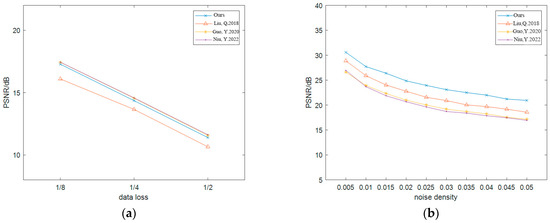 Figure 13 shows the PSNR test results of Lena under different intensity cropping and noise attacks. In the cropping attack, the PSNR of this algorithm is higher than that in [4] and lower than that in [7,8], but the gap is small. In the noise attack, this algorithm has the highest PSNR and the best ability to resist SPN, SN, and GN attacks.