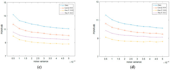 The PSNR test results of Lena (a) cropping attack; (b) SPN [4]; (c) SN [7]; (d) GN [8].