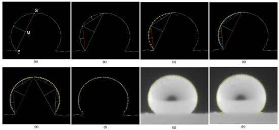 By repeating the previous process between each two successive edge points starting at (S) and ending with (E), we obtain the edge points shown in Figure 4c,d. Figure 4e shows the same previous process on the right side of the droplet. Figure 4f shows the edge points obtained from the gradient method with the active contour line, while Figure 4g shows the retrieved edge points on the original image. Figure 4h shows the edge points along the boundaries of the droplet as well as the contact area between the droplet and the base.