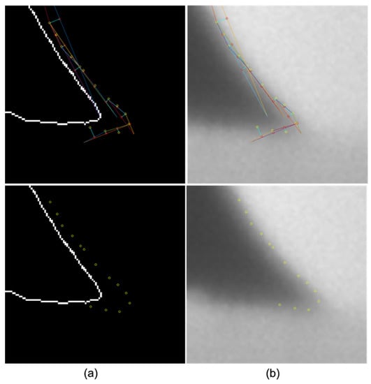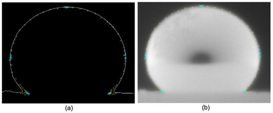 To obtain the edge points in the contact area between the droplet and the base, the same process was used but with different reference points as shown in Figure 5, where Figure 5a shows the edge points obtained from the gradient method and the active contour line, and Figure 5b shows the edge points on the original image. We can see that the proposed edge detection method based on local gradient estimation performs better than the state-of-the art procedure.
