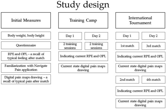 After initial measures and familiarization with the Navigate Pain app, the participants drew pain maps showing a recall of typical pain (RP)—a recall of what they experience typically after a match following a one-week-long training microcycle. The study of Galve Villa, Palsson and Boudreau (2021) showed high accuracy and repeatability by comparing the current pain and its recall using a digital pain drawing [18]. During the 2-day TC, there were 2 training sessions each day of 90 min each. The players were drawing digital pain maps of their current state immediately after the end of the second training session. During 2 days of IT, there were 2 matches each day of 50 min each. The players were drawing digital pain maps of their current state immediately after the end of each of four tournament matches. The use of Navigate Pain App showed validity and reliability for assessment of pain parameters in patients [16,17,18]. Immediately after ending training or a match, the players individually noted with software a rating of perceived exertion (RPE—CR10) and overall pain level (OPL) using the visual numerical scale. The scales’ values were from 0 to 10, where 0 means no exertion or pain, 1 is the lowest and 10 the highest value of exertion or pain, respectively. Using RPE shows validity and reliability for the quantifying session and match load [19,20,21]. The main outcome extracted from digital pain drawings was the total pain area registered in pixels. The main outcomes extracted from RPE and OPL were average values after each day of TC and each match of IT.
