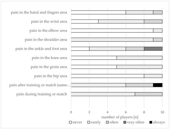 Every participant reported pain during training and matches, as well as after this type of activity, as shown in Figure 2 and Figure 3. Further, six out of ten players reported that pain limited their performance, and four out of ten players stated that pain does not limit their performance at all. Simultaneously, 9 out of 10 reported that their current pain does not influence their motivation to play and train.