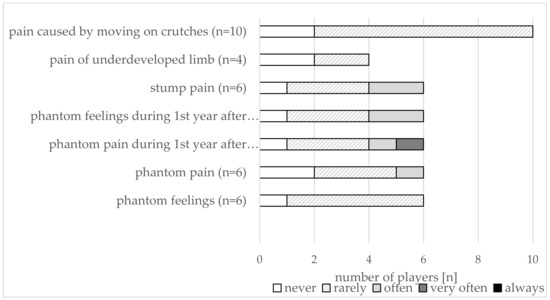 The frequency of phantom pain, stump pain and pain identified as coming from moving on crutches to disability in Amputee Football field players. Different n numbers: n = 10 for all field players, n = 4 for players with congenital agenesia, n = 6 for players with lower limb amputation.