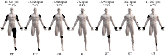 The average total pain area (sum of the front and back areas in pixels, divided by the number of players) was the highest when players drew digital pain maps describing a recall of typical pain with no significant differences compared to the end of TC, p = 0.959. The total pain area was 42.7% lower at the end of IT compared to the pain area of a recall of typical situation, p = 0.028, but there were no significant differences in comparing the end of IT to the end of TC, p = 0.074. The differences between the following matches of IT and between the following days of the TC were not significant (Figure 5). Digital pain drawings individualized according to the disability of the representative player from the front and back views are presented below in Figure 6 and Figure 7.