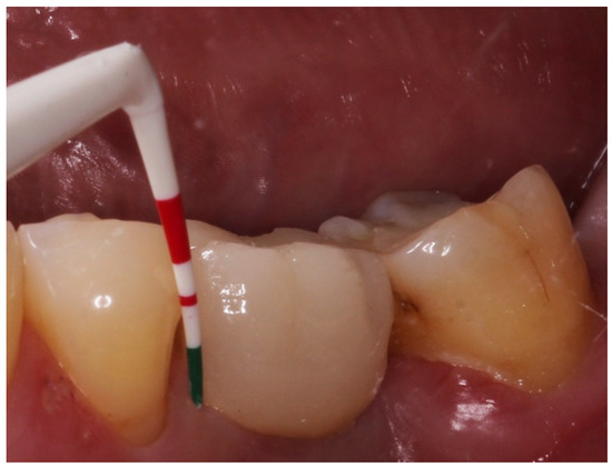 Variables related to the subject were collected; such as age, gender, tobacco consumption and history of periodontitis, as well as variables related to the implants. The main parameter was the presence of keratinized mucosa (KM), as well as the width of KM measured in millimeters in the mid-buccal surface of the implants with a periodontal probe CP 15 from Hu-friedy® (Frankfurt, Germany). The absence of KM was considered when there was non-keratinized mucosa at the gingival margin of the implant (Figure 1). Recession (the apical migration of the gingival margin) was measured in the mid-buccal surface from the cervical margin of the crown, where the gingival margin was located at the time of prosthesis placement. Other parameters were: Silness and Löe plaque index (Figure 2); probing depth using a plastic periodontal probe (Premier®) (at six points: mesiobuccal, buccal, distobuccal, mesiopalatal, palatal and distopalatal) (Figure 3); bleeding (its presence or absence was measured); suppuration (its presence or absence was measured); and bone level (distance, in mm, between the implant shoulder and the base of the defect) using Rhinoceros® software (Robert Mcneel & Associates, Seattle, WA, USA) on the parallelized radiographs. Bone loss due to peri-implantitis was considered when a crater-shaped image was observed surrounding the implant (taking as reference the most apical area of the crater) (Figure 4), accompanied by clinical signs such as bleeding or suppuration. The years since prosthesis placement were also noted. All data were collected by a single operator who visually analyzed the esthetics of the peri-implant tissues.