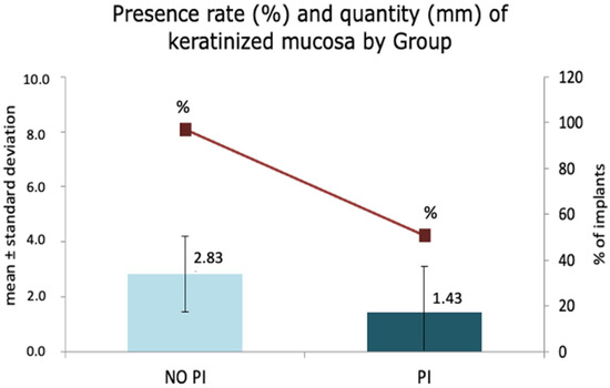 Presence rate (%) and quantity (mm) of keratinized mucosa by Groups. PI (peri-implantitis).
