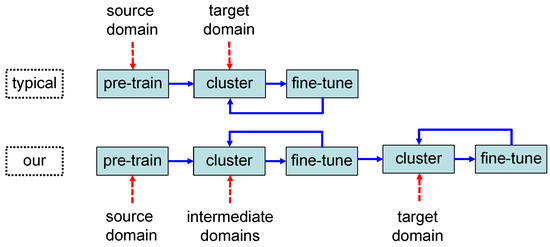 We followed the UDA strong baseline in [6], which consists of three main stages, namely, model pre-training, clustering and fine-tuning. The baseline of our proposed method is shown in Figure 2. Typical UDA methods directly transfer the model trained on the source domain to the target domain. We first pre-trained the model using source labeled data and then fine-tuned the model on unlabeled intermediate domains and generated pseudo labels on the basis of clustering results. Finally, we conducted clustering on the unlabeled target domain and fine-tuned the model with pseudo labels. Notably, the intermediate domains consist of a series of domains instead of one dataset. That is, the fine-tuning process is repeated between one intermediate domain and another.