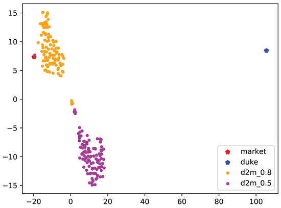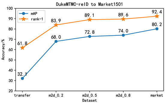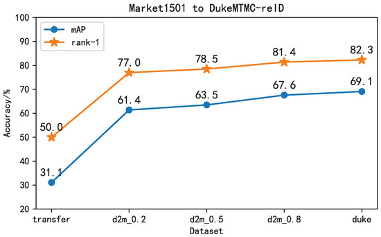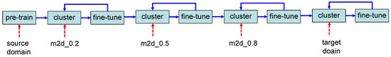 We followed the strong baseline used in [6], which exploits contrastive loss and MMT. We pre-trained the network using source domain labeled data in the pre-training stage. We performed clustering on the unlabeled intermediate domain data using the more accurate features from the mean teacher model and generated pseudo labels based on the clustering results in the clustering stage. Finally, the clustering stage was repeated on the unlabeled target domain. Take the Market1501 to Duke-MTMC-reID for example; the process of training via intermediate domains is shown in Figure 4. m2d_0.2 denotes the unlabeled intermediate domain generated by GAN with Market1501 and DukeMTMC-reID datasets as source and target domains, respectively, for a domainness factor of .