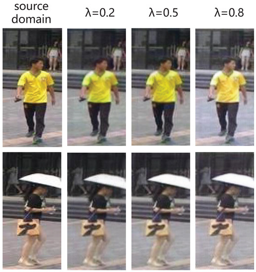Intermediate domains are proposed to bridge the source and target domains. The style of the images is gradually changed in the training process of GAN. A large domainness factor indicates that the image style is closer to the target domain. Figure 5 shows the effect of the loss function with different values in Equation (13) on the image generated by GAN. Illumination is a very important factor that affects the image style for ReID datasets. The gradual enhancement of the illumination of the image with the increase in proves that the domainness factor can control the style of generated images (Figure 5).