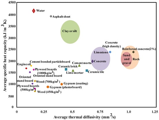 Note that many factors must be ensured to guarantee a long life of SHSMs such as thermal and chemical stability (constant thermal properties, no chemical decomposition and no degradation) at high temperature gradient regardless of the number of cycles (charge/discharge). According to Klein et al. [42], storage substances should conduct heat better, have higher specific heat and density, be able to operate in a suitable temperature range and be easily accessible in terms of cost. Figure 6 displays the average volumetric specific heat capacity vs. average thermal diffusivity for the most available SHSMs [18].