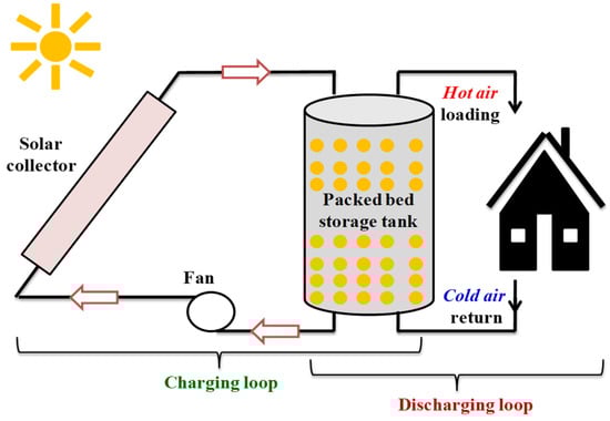 Without detailing, the SHS mode consists of a sensible heat storage material (SHSM), an SHSM container (e.g., tank) to prevent leakage and heat losses and input/output devices [47].Among the tools used in this storage mode, SHS in a porous medium is the most preferred solution. Out of the available case studies in the literature in this field, a few representative ones are reviewed in the present section. Saturated tanks of porous solid SHSMs are used in many industrial and building applications such as power generation and heating [3]. Figure 7 exemplifies a residential heating application using a porous fixed bed storage tank. In general, a fixed bed storage tank is used for the TES of solar air heaters and represents a volume of porous medium formed by packing particles of selected SHSM into a container. In this system, the working fluid (e.g., air) advects heat from the collector to the reservoir. Hot fluid passes through spaces between solid SHSMs (e.g., rock or sand), causing the particles to rise in temperature during the day (charging loop), and the quantity of sensible heat stored inside the tank is recovered during the night (discharging loop).