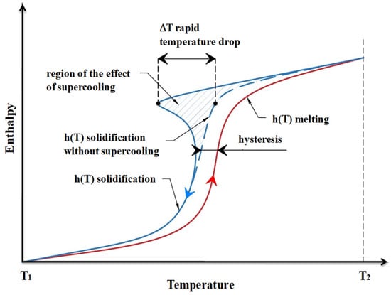 Supercooling, phase segregation, convection and impurities problems are encountered in PCMs such as hydrated salts, octadecane, etc. During the cooling process, the substance temperature drops below the melting range () without starting the solidification mode. Thereby, nucleation is triggered, causing a sudden rise in temperature to the melting point. Under supercooling, the onset of solidification is delayed, and the liquid solidifies at a temperature under its freezing temperature, causing a lag between the design and the real behavior of the considered PCM. Likewise, in case of ignorance or overestimation of supercooling, experimentation and numerical simulation exhibit a time lag [70,71]. Figure 9 illustrates the supercooling of a PCM [72].