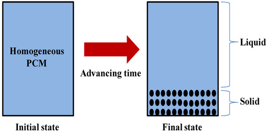 Phase segregation represents another crucial issue of some PCMs, in particular salt hydrates. It consists of a separation of phases causing an accumulation of the dense phase as seen in Figure 10 [3]. Therefore, the PCM split into different phases loses its expected characteristics and cannot be used in an LHS application. In this context, thickeners are the most commonly used solutions to avoid phase segregation.