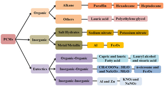 As tacitly stated above, PCMs can be split into PCM solid/solid, PCM solid–liquid, PCM solid/gas and PCM liquid–gas. It is solid–liquid PCMs that are involved in this section and can be divided into organic, inorganic and eutectic, as depicted in Figure 11 [3,20,24,75,76,77]. In addition, an attempt to compare the groups that have been up-cited is provided in Table 5 [24,77].