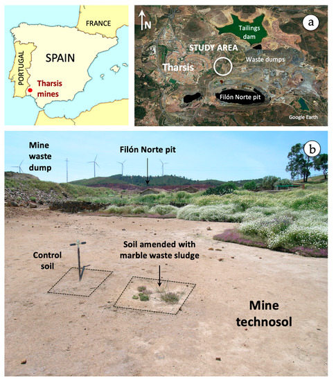 Location map of the study area showing a satellite view of the mining area of Tharsis (a), and a field picture of the field experimental site (b).