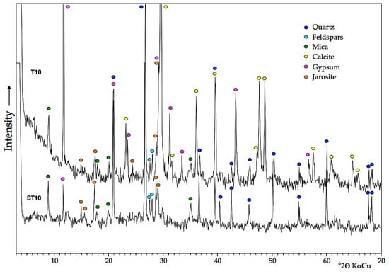 XRPD diffractograms of topsoil samples of amended soil (T10) and control soil (ST10).