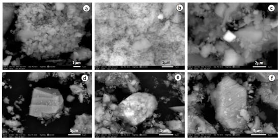 ESEM-BSE images showing salient mineralogical and textural features of the amended soil after 12 years of amendment application: (a) aggregate of jarosite with pseudocubic habit of euhedral crystals; (b) iron oxide nanoparticle aggregate; (c) isolated pseudocubic crystal of plumbojarosite; (d) calcite grain with dissolution grooves on its surface; (e) iron oxide coating calcite grain; and (f) newly-formed crystal of gypsum.
