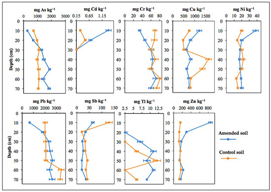 Vertical distribution of trace elements along the two sampling sections (amended and control) of the soil profile.