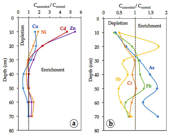 Soil profile distribution of the concentration factor (calculated by dividing the total content of each trace element in the amended soil by that in the unamended soil) for: (a) Cd, Cu, Ni, and Zn; and (b) As, Cr, Sb, and Pb.