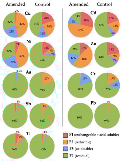 In brief, most Pb, As, Sb, Tl, and Cr were found accumulated in the residual fraction (F4) of both treated and untreated soil; the fractionation patterns of Cu and Ni were fairly similar as they appear more or less evenly distributed among F2, F3, and F4 fractions; and Cd and Zn seemed preferentially partitioned among the most labile compartments (F1 and F2).