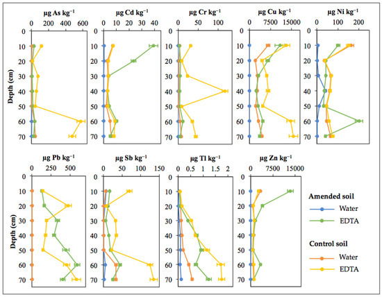 Vertical distribution of trace element concentrations extracted by deionized water and EDTA from the two sampling sections (amended and control) of the soil profile.