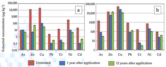 Certainly, Zn and Cu were the most abundant PHE in the topsoil extracts of the amended plot, where the EDTA-extracted concentrations reached up to 13,419 µg kg−1 and 10,877 µg kg−1, respectively. Despite the high levels of Zn and Cu measured in the extracts, the mobilizable fraction of Zn was 1.58%, and that for Cu accounted for only 0.90%. The maximum contents of Pb (402–589 µg kg−1) were extracted from the subsoil samples (50–70 cm depth), while the remaining PHE were at lower concentration in the extracts (mostly below 50 µg kg−1) over the entire soil profile.