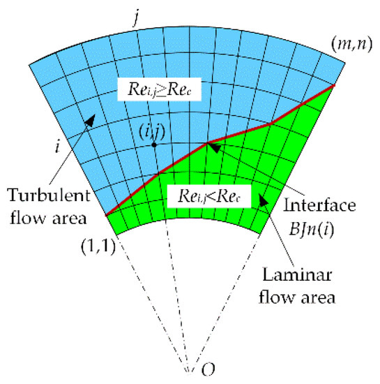 The core of the arithmetic lies in the partitioning of regions and the choice of Reynolds equations. The basic procedures of the algorithm are as follows: (1) divide the pad into m × n grids, where the vertices of each grid represent nodes, (2) compare the nodes’ Reynolds numbers Re(i,j) with the critical Reynolds number Rec to find out the nodes that are approximately equal to each other, defining them as BJn(i), and (3) connect all BJn(i) into a line as the junction line between the laminar and turbulent flow areas.