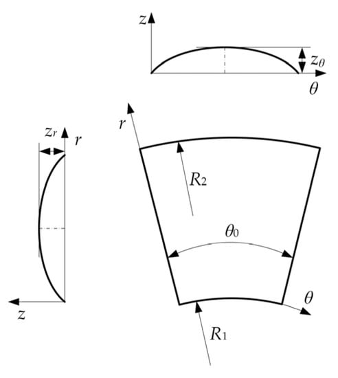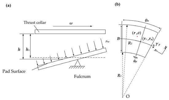As shown in Figure 2, the pad surface of the WTTB is fan-shaped, and the pad can be tilted around the fulcrum. R1 and R2 are the inner and outer radii of the pad, respectively. θ0 is the pad sector angle. The Reynolds equation considering the flow pattern and ignoring the inertial force effect according to [18,19] is as follows: