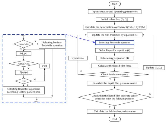 Rec can be used to define the transition from laminar to turbulent flow as the fluid flow rate increases. It can be found in [23] that Rec equals 1600. Remax is the maximum node Reynolds number. For the turbulent flow pattern (single flow pattern), the average Reynolds number can be calculated using the average film thickness, average viscosity, and average linear velocity. The flow coefficients can be obtained by inputting the average Reynolds number into Equation (3). The bearing performance is obtained by solving the turbulence model. For the node mixing flow pattern, Re(i,j) is compared with Rec. If it is less than Rec, the flow coefficient of the node is taken to be 1/12. Otherwise, the flow coefficient can be calculated through Equation (3). The distribution of the flow pattern coefficient is substituted into the Reynolds equation and energy equation. The bearing lubrication performance is obtained by solving the node lubrication model. For the regional mixing flow pattern, it combines the features of the two above patterns. The pad interface is divided into a laminar and turbulent flow area by comparing Re(i,j) with Rec. The laminar and turbulent lubrication models are used for each region, and the bearing performance is obtained after a comprehensive solution.