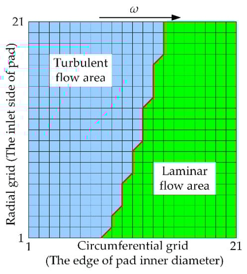 Twenty grids were divided equally along the circumferential and radial directions of the pad, and the flow pattern partition of the pad interface was obtained using the regional mixing flow pattern mode. As shown in Figure 4, the blue and green areas are turbulent and laminar flow areas, respectively. The red line is the boundary between the two areas. The bearing should be in a mixing flow state, and the area ratio of the laminar flow area to the turbulent flow area was about 0.87:1.
