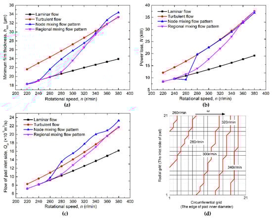 The rotational speeds and loads determine the film thickness distribution of the bearing, which in turn affects the Reynolds number of the pad. Figure 4 presents the simulation results obtained for the bearing performance under the four flow patterns at different rotational speeds. As shown in Figure 5a–c, when the rotational speed was less than 260 r/min, the minimum film thickness, power consumption, and inlet flow rate of the regional mixing flow pattern were close to those of the laminar flow pattern. When the rotational speed was greater than 360 r/min, the values almost coincided with those of the turbulent flow pattern.
