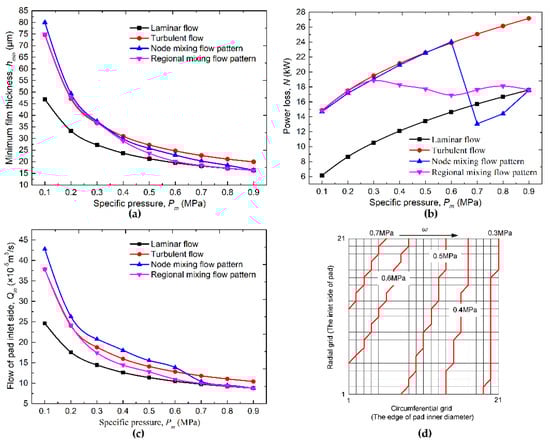 Figure 6 presents the simulation results obtained for the bearing performance under the four flow pattern modes at different specific pressures. As shown in Figure 6a–c, the minimum film thickness, power consumption, and inlet flow rate of the regional mixing flow pattern were close at first to those of the turbulent flow and then gradually became more similar to those of the laminar flow with the increase in the specific pressure. There was a fluctuation between specific pressures of 0.6 and 0.7 MPa, as shown in Figure 6b, for the node mixing flow pattern. The Reynolds number of each node was calculated, and each Gθ and Gr of the laminar and turbulence flows were substituted into Equation (2). Since Gθ and Gr were 1/12 in the laminar flow and obtained by Equation (3) in the turbulent flow, the values were not continuous, which led to the discontinuity of h and μ. According to Equation (9), the power loss of the pad is determined by these two important parameters. As a consequence, there is a fluctuation as the specific pressure increases. As shown in Figure 6d, when the specific pressure was between 0.3 and 0.7 MPa, the bearing interface was in the mixing flow, and the bearing performance should be between that of the laminar and turbulent flows. With the increase in the specific pressure, the turbulent flow area decreased gradually; that is to say that although the bearing flow pattern was close to a full turbulent flow under a light load, the heavy load made the flow pattern change to a laminar flow. When the specific pressure reached 0.6 MPa, the average Reynolds number was 1494, and a large part of the laminar flow area appeared on the bearing interface. The regional mixing flow pattern mode was more suitable for analyzing the bearing performance. For the laminar and turbulent flow transition, the actual bearing interface may have a transition zone for flow pattern transition, and there may be a small error if the transition zone is assumed to be a transition line [4,5,6]. From the point of view of approximate design, it should be reasonable to determine the transition zone through a range of critical Reynolds numbers and calculate the bearing performance in this state.
