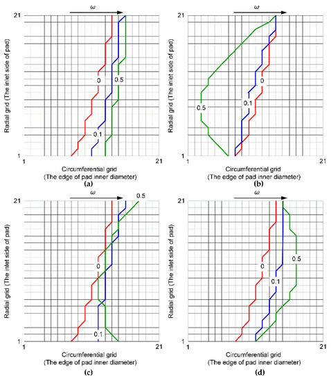 The simulation example shows that it is feasible to adjust the flow pattern by changing the pad shape. The circumferential bulge (zθ > 0) and radial concave (zr < 0) of the pad’s surface are beneficial for increasing the turbulent area, which will obviously improve the load-carrying capacity. In addition, the performance of the six pads changed accordingly with the degree of convexity and concavity. The performance seemed to be related to the fluid property of the pad itself. However, the minimum film thickness of the cylindrical pad showed an extreme fluctuation with the change in Δc. When Δc was 0.7, the minimum film thickness was the largest. This means that an excessive value of Δc will hinder the water flow on the pad’s surface, thereby affecting the formation of the water film.